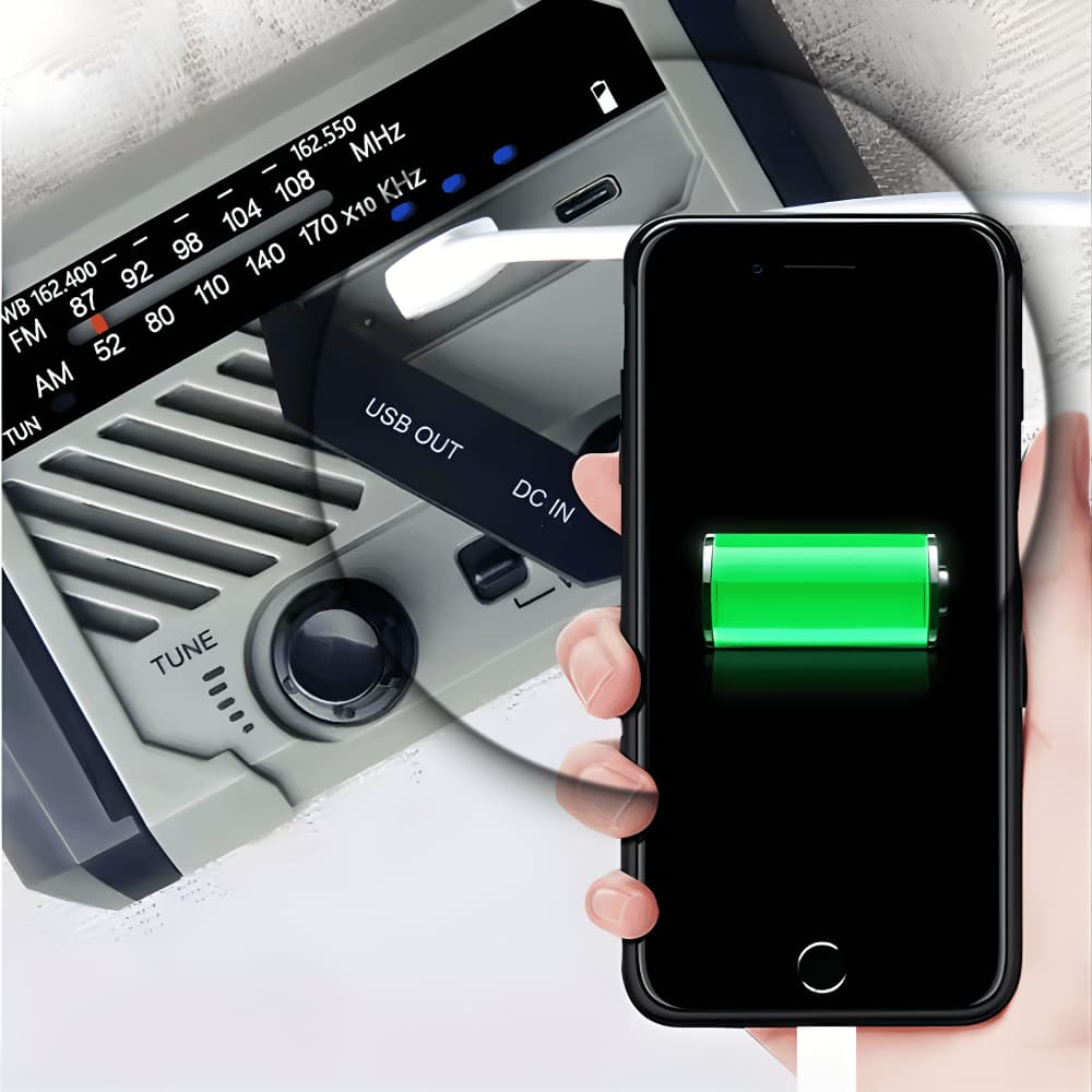You can charge it in four ways: via solar power, hand crank, USB cable, or a replaceable battery. Stay powered even without electricity.