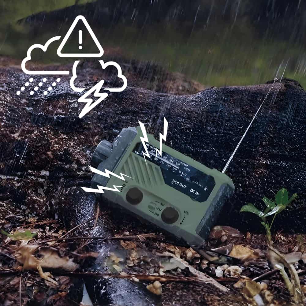 The radio receives FM, AM, and WB frequencies and offers access to 7 NOAA weather channels. Stay informed even without internet access.