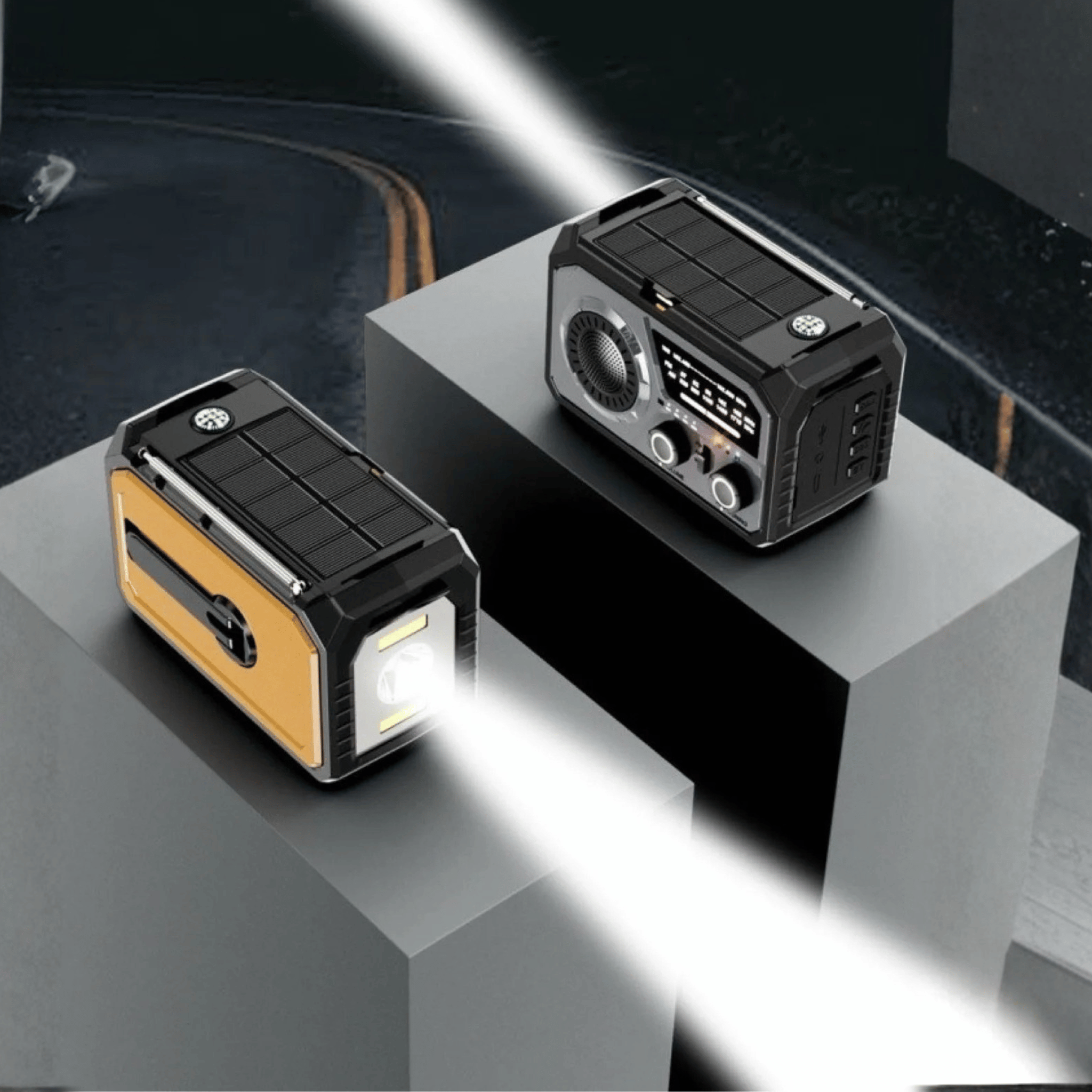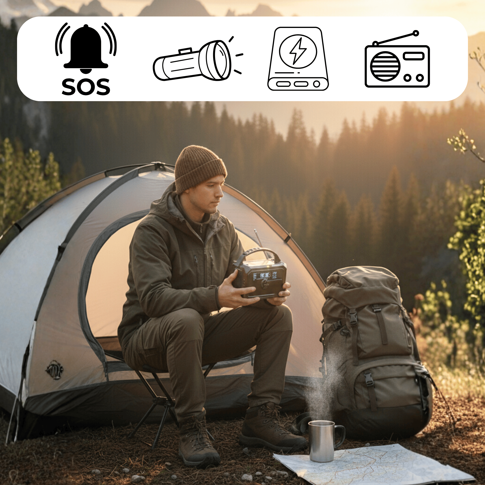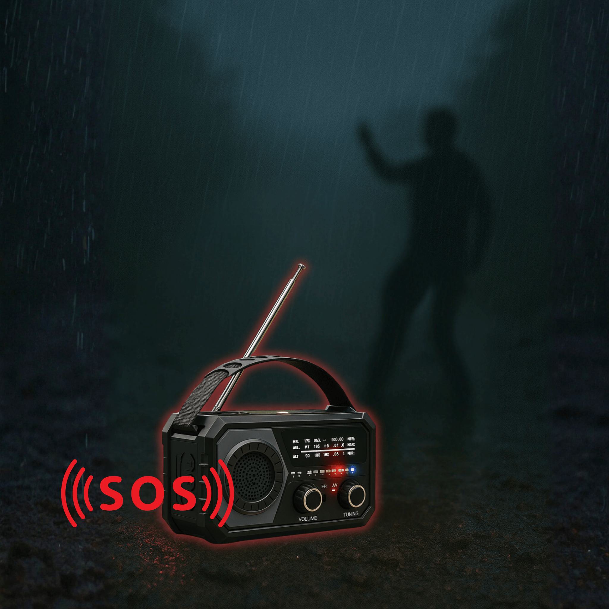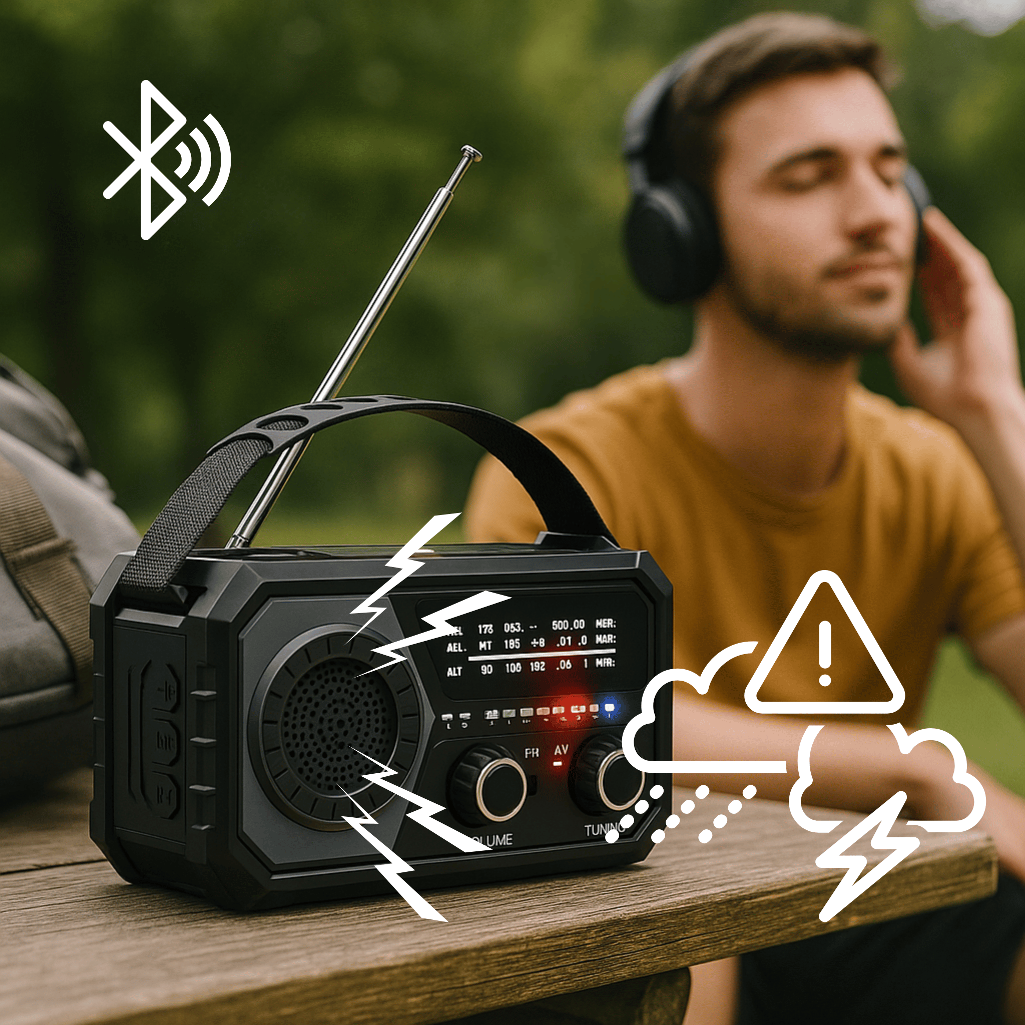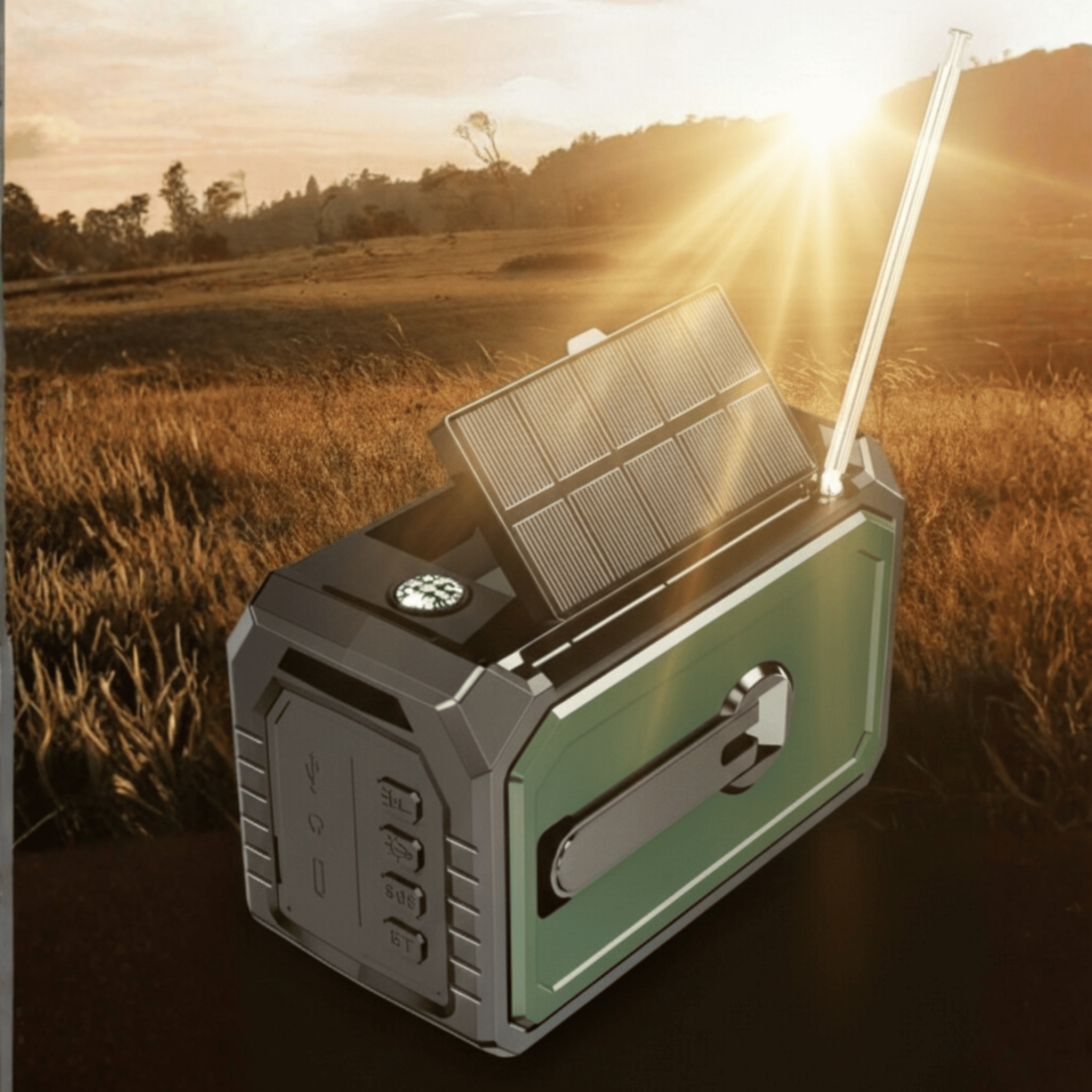 This versatile multitool combines a radio, flashlight, power bank, Bluetooth speaker, and SOS alarm in one compact, durable design.